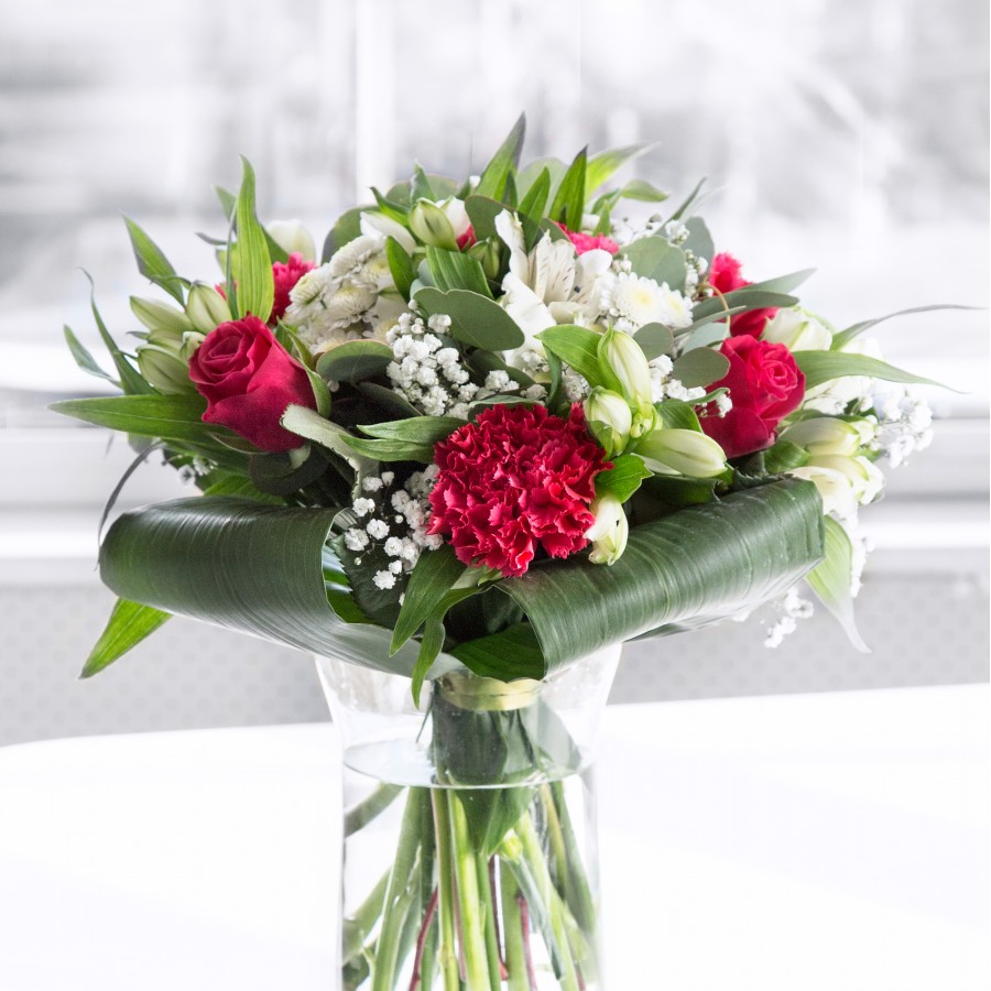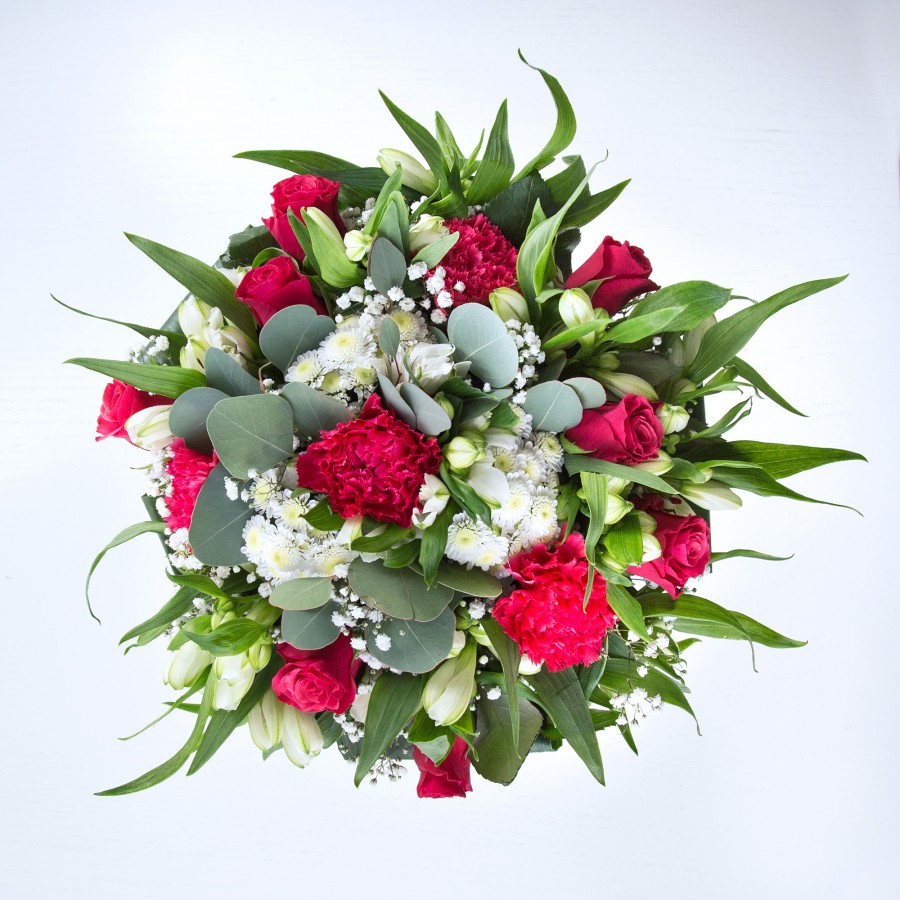 We pride ourselves on the quality and freshness of our flowers, each hand-selected to ensure a stunning presentation. The inclusion of white alstroemeria and aspidistra leaves adds depth and elegance to the design.